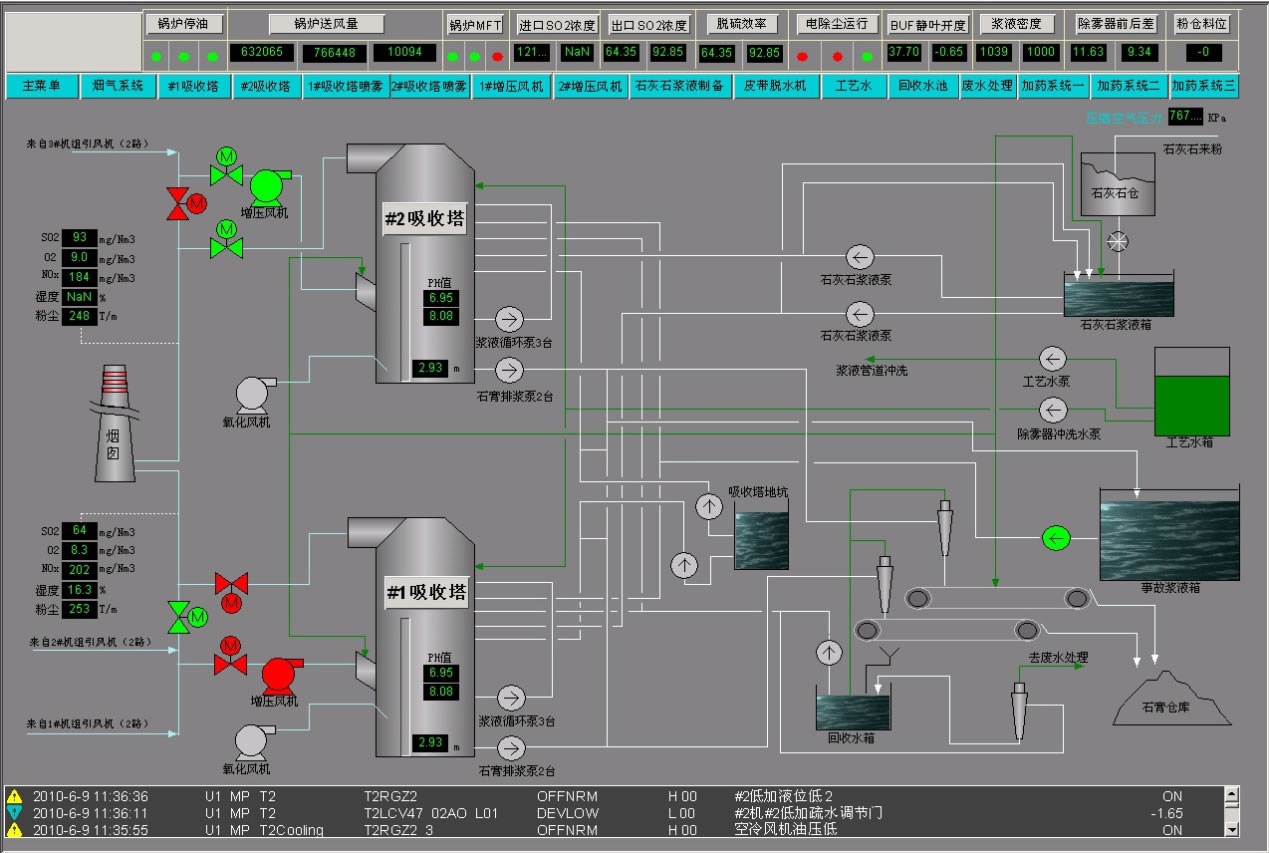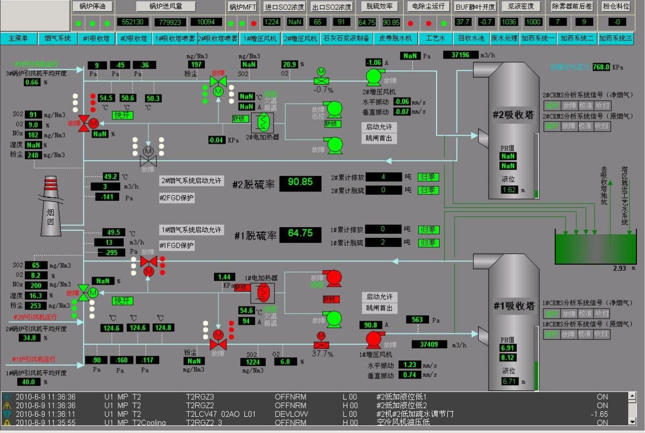 脱硫控制系统主要针对脱硫设备中的烟气系统、石灰石将液制备、增压风机、皮带脱水机、吸收塔、回收水池、吸收塔、废水处理系统等设备装置进行集中监测及控制。通过工程师站完成设备操作、过程监视、故障报警、事件记录以及策略组态和维护等功能。